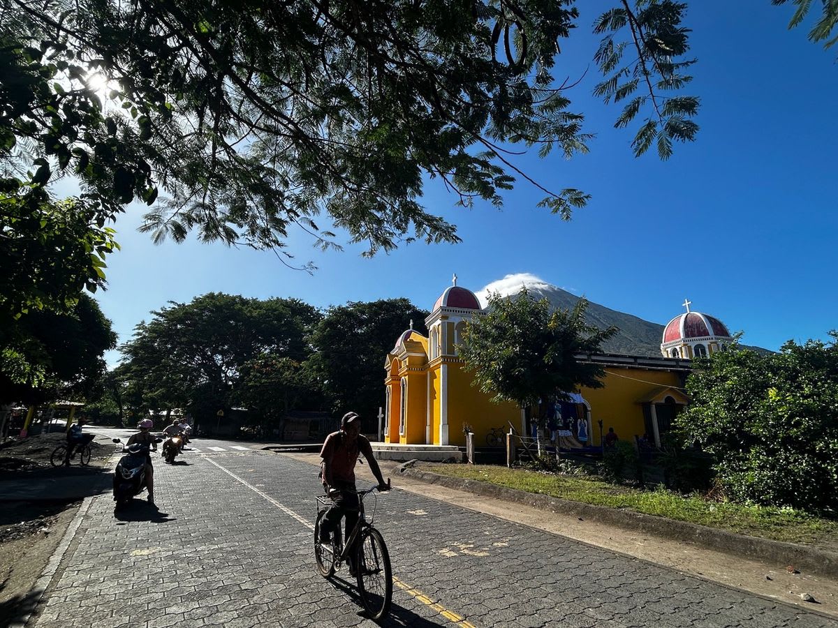 De schouderhoge bronzen Sandino bij de aanlegsteiger van Ometepe valt nauwelijks op tussen de verhuurbedrijfjes van scooters en mountainbikes. We lopen naar ons hotel op de heuvel, waar de eigenaren Jorge en Elena ons scooterrijles geven op een honkbalveld. Spontaan vertelt Jorge over de crisis van 2018, toen Nicaragua rood kleurde op de reisadvieskaartjes. De toeristen bleven weg. Om te kunnen eten waren de inwoners van Ometepe, zo’n dertigduizend in getal, weer gaan schoffelen in hun moestuinen. Bloemperken werden yuccaveldjes. ‘Onze grootouders waren campesinos,’ zegt Jorge, ‘onze ouders zijn dit hotel begonnen, en wij werden ineens weer campesinos.’