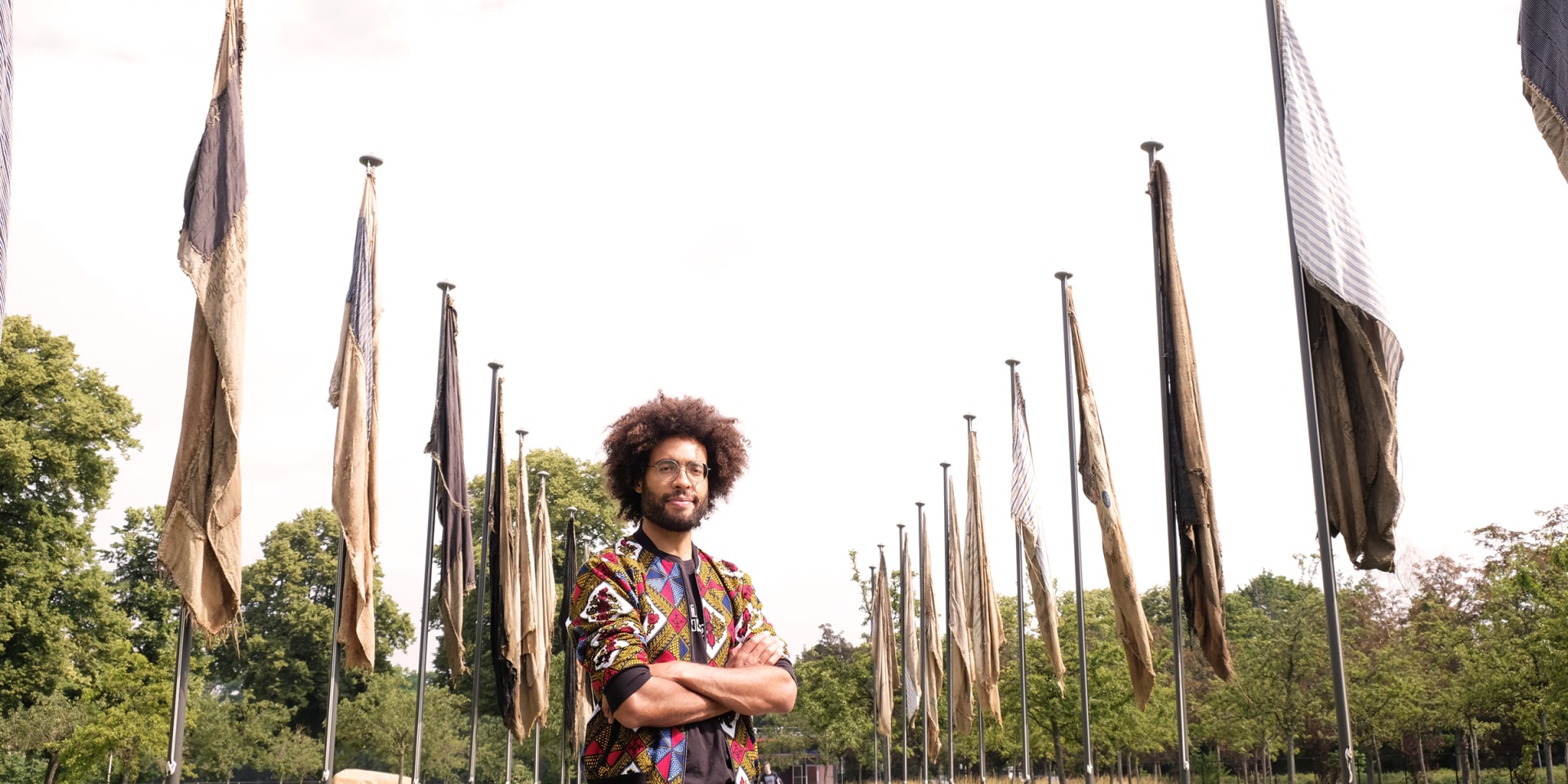 Het is windstil. De juten vlaggen van Ibrahim Mahama hangen er roerloos bij. De opstelling van de vlaggenmasten geeft het grindpad de uitstraling van een laan. Mahama klaagt aan dat zijn nationale trots gebaseerd is op ellende en ongelijkheid.