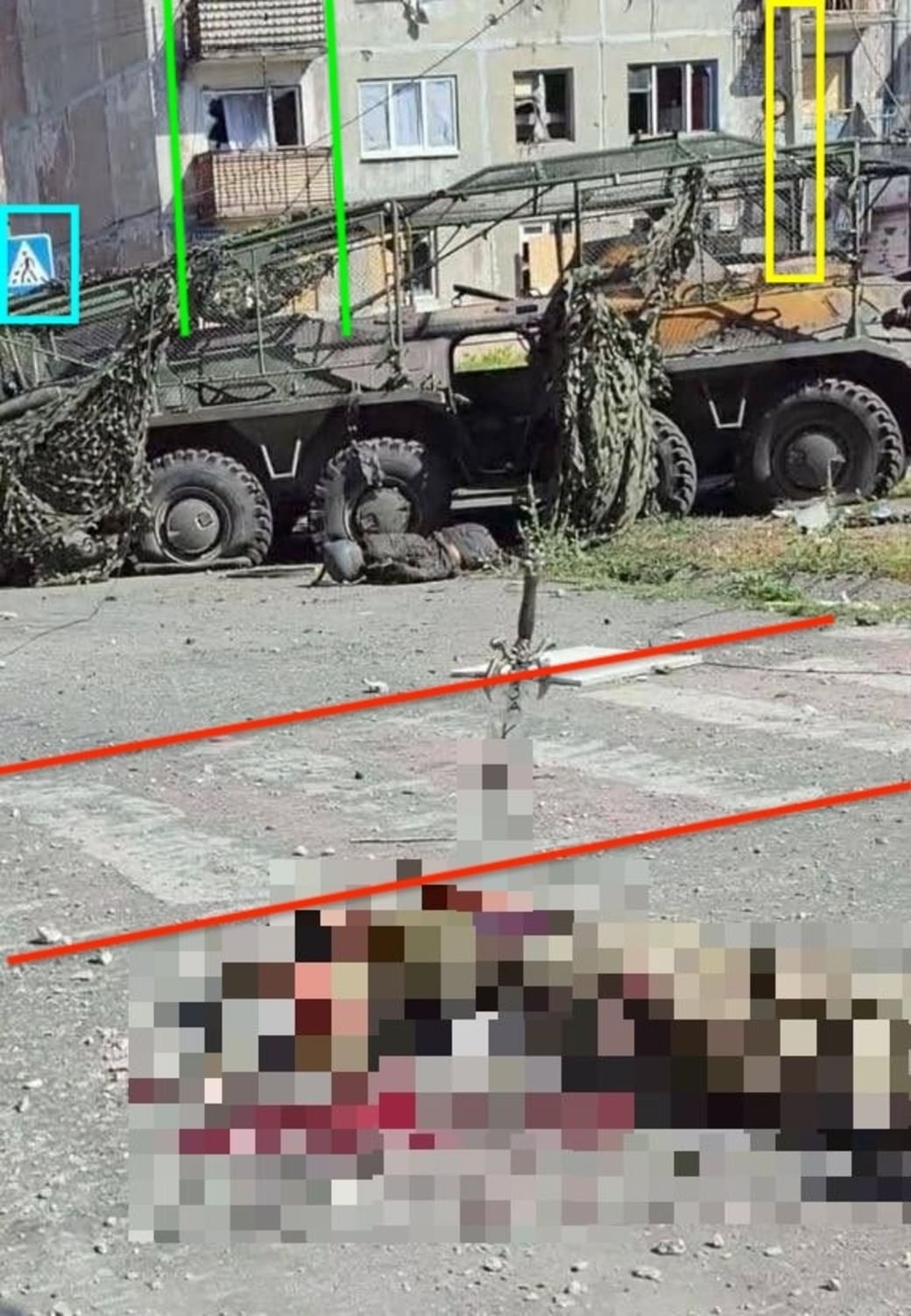 Geolocatie van een vermoorde Oekraïense krijgsgevangene met een zwaard dat uit zijn borst steekt en de inkerving За Курск (voor Kursk). De locatie is Novohrodivka, 40 km ten noordwesten van Donetsk. © Benjamin Strick