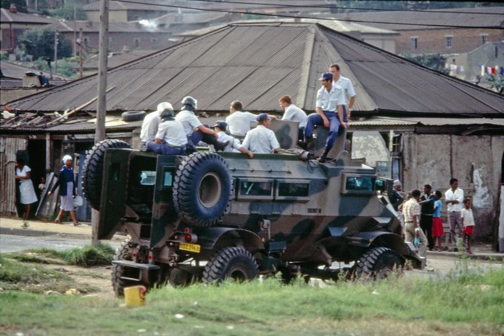 Zuid-Afrikaanse politie bij de township Alexandra, Johannesburg in 1985