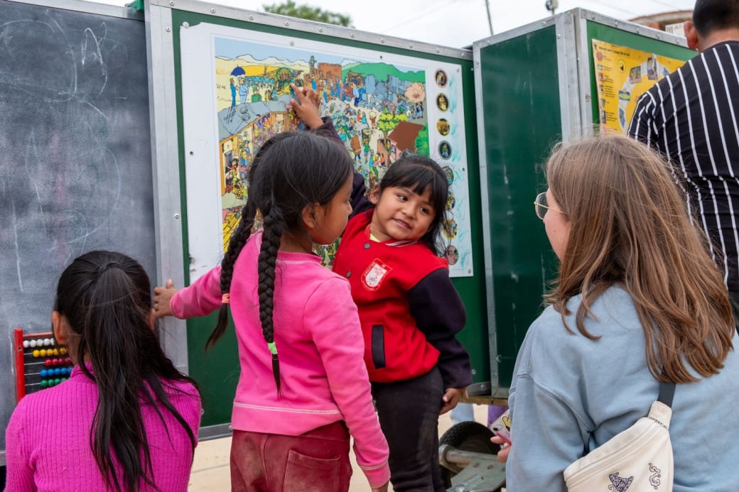 Dinsdagmiddag in Lajastambo, een buitenwijk van Sucre. Leraar Rodrigo Lora rijdt luid toeterend met zijn Mobiele Schooltje het voetbalveldje van de wijk op, waarna hij en vier Europese vrijwilligers een aanhanger met een meterslang schoolbord vol didactische spellen uitklappen. Binnen vijf minuten hebben veertig kinderen zich verzameld. ‘Hola profe!’, roepen ze enthousiast, en ze storten zich op de spellen.