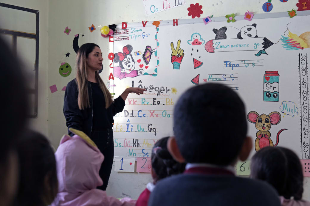 ‘Pioniers leerden dorpelingen ondergronds het Koerdische alfabet aan’, zegt Ahmed Majid, gemeenteraadslid voor de PYD in het dorp Gerbawi. Aan een begraafplaats voor gesneuvelde YPG-soldaten staat een groot portret van Öcalan. Toen de YPG meer gebied veroverde en in 2014 het zelfbestuur werd uitgeroepen, verschenen er Koerdische scholen in de meest afgelegen dorpen, opgezet door lokale onderwijscomités. Er werd een nieuw instituut opgericht om leraren op te leiden en een lesprogramma te ontwikkelen in de drie officiële talen: het Koerdisch, het Arabisch en het Aramees.